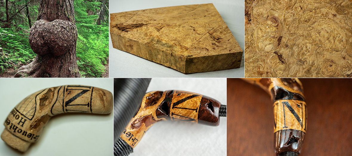 The bottom end of the base is finished with a hand carved and stained piece of locally harvested maple burl. This end cap, designed as a continuation of the lamp shade, is hollowed for the electric cloth wrapped cord to run through and hand branded using pyrography. Burl is used in part for its beauty, and just as importantly used for its density diversity irregularities and grain fingerprint. Burl has an incredibly complex grain pattern impossible to reproduce, protecting your investment from potential forgers.